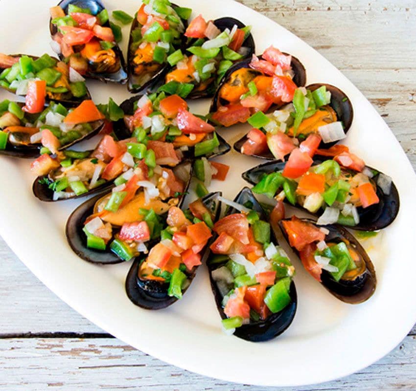 Un clásico que no puede faltar en esta selección son estos moluscos acompañados por un picadito de verduras y una vinagreta básica. Una de las formas más habituales de cocinar los mejilones es así y es de nuestras favoritas.