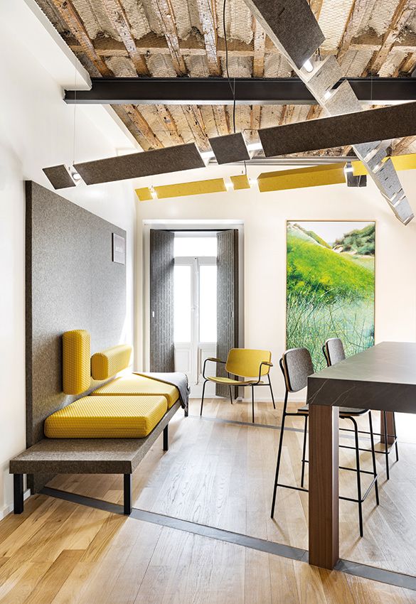 Un espacio concebido según la idea del Art Brut sofisticado, combinando las formas toscas de la arquitectura más depurada con la elegancia y pulcritud de los materiales. "Pretendemos mostrar que es posible añadir color a los espacios neutros y conseguir un entorno agradable, pero lleno de energía y felicidad", señalan los responsables del diseño de este salón. Aquí, las piezas se ensamblan como en un Lego (mira el suelo, realizado con material Laminam). A través del uso del color se incorporan también las formas geométricas al espacio. Todo vibra, pero sin resultar estridente o desordenado. En la pared, obras de Jaime Jurado.