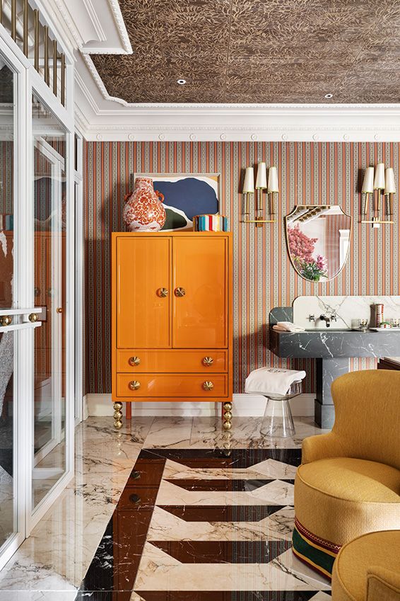 En este espacio, el diseñador lleva el color al baño. Nada de un espacio neutro en blanco. Este baño es un centro wellness inspirado en Hollywood. Un templo de relajación, sofisticado, donde los materiales como la piedra sinterizada de Neolith ya introduce color con su veteado. Pero aquí, además, los muebles, que mezclan piezas actuales con otras recuperadas, se tiñan en color para destacar. No faltan tampoco las telas de colores vibrantes y las notas de color que introducen también las obras de arte en las paredes. Revestimiento mural de Arte International, molduras de Orac Decor, griferías de Axor y adornos de porcelana de Vista Alegre.