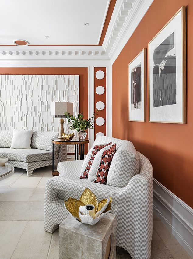 Color en las paredes, detalles muy concretos de esa tonalidad en algunos elementos decorativos y, el resto, en blanco. El interiorista Raúl Martins crea una mezcla que funciona en un entorno clásico que busca los contrastes. El color anaranjado de la pared, un teja muy cálido, "sale" de la tierra como otros marrones, blancos y beiges usados en distintas intensidades. Suelo de piedra de Espacio Nazaríes, decoración en escayola de Escayola Saz, panelados de la pared imitación azulejo de Panespol, textiles de KA International, y sofás y butacas de Ormo's.