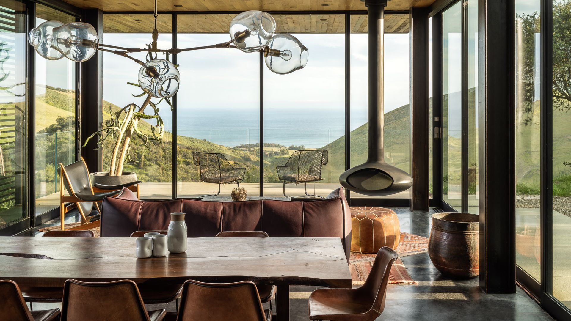 Precisamente para difuminar las líneas y límites entre la construcción y el paisaje, entre el interior y el exterior, la arquitectura responde a una caja de vidrio. Tres de las cuatro fachadas son de cristal de manera que permiten una vista casi 360º con el océano y el cañón como horizonte. Para el interiorismo de este proyecto, ANACAPA trabajó de la mano de Jessica Helgerson Interior Design (www.jhinteriordesign.com), que ideó un interior confortable, práctico y que rebosara personalidad. Al uso de acero, hormigón y vidrio se suma la madera y el cuero en el mobiliario. Esta imagen muestra el salón y el comedor. El primero, pegado a la fachada, con asientos orientados a ella y una elegante chimenea colgante.