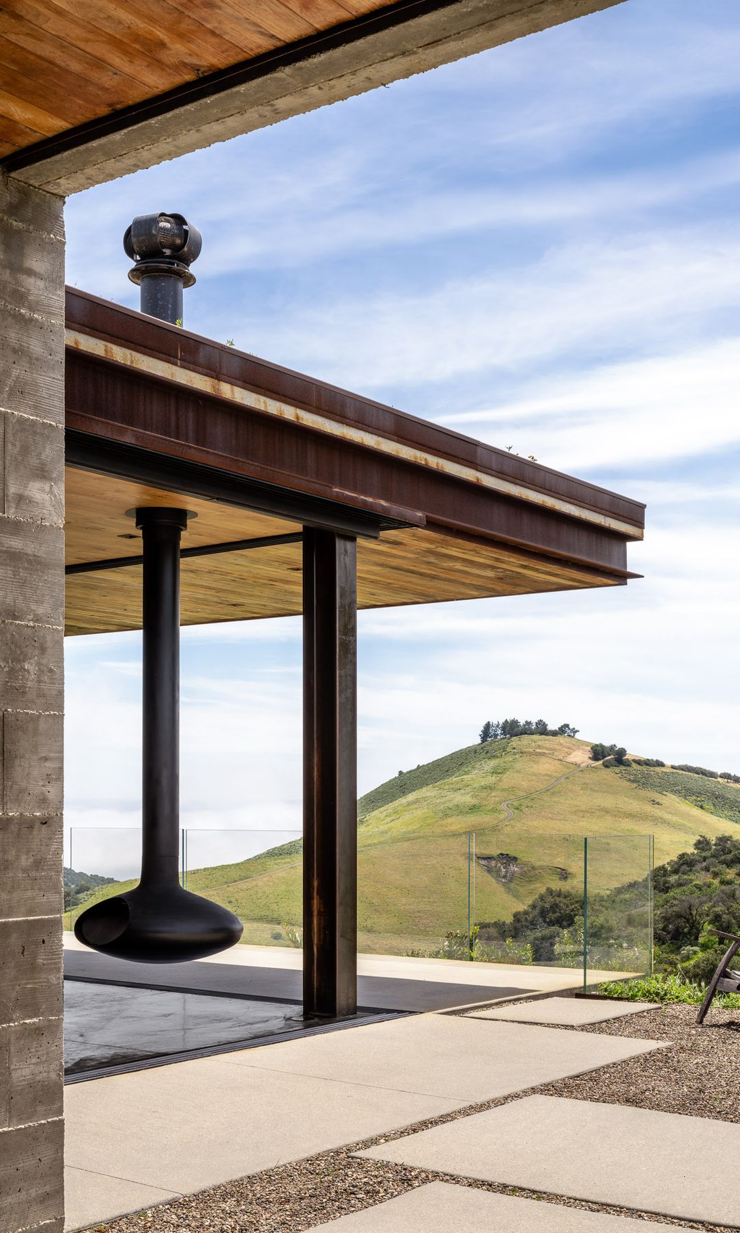 También se diseñó la casa con amplias terrazas, de forma que se elevan en voladizo sobre la pared rocosa del acantilado, dando una sensación de ligereza y suspensión de la arquitectura. “Dado que la estructura está ubicada en la cima de una colina, es visible desde la distancia. No queríamos que sobresaliera ni llamara la atención. Nuestro objetivo era que tuviera el menor impacto posible en el entorno natural y mejorara la integridad ecológica de la propiedad en lugar de degradarla aún más”, señala Dan Weber, arquitecto de la casa. Para disfrutar de lo que ofrece la situación, la casa cuenta con grandes paneles corredizos de vidrio que no solo permiten disfrutar visualmente del entorno sino que favorecen la apertura y conexión total, eliminando físicamente los límites entre el interior y el exterior. El diseño arquitectónico incluye un garaje independiente, que también está discretamente construido en la ladera.
