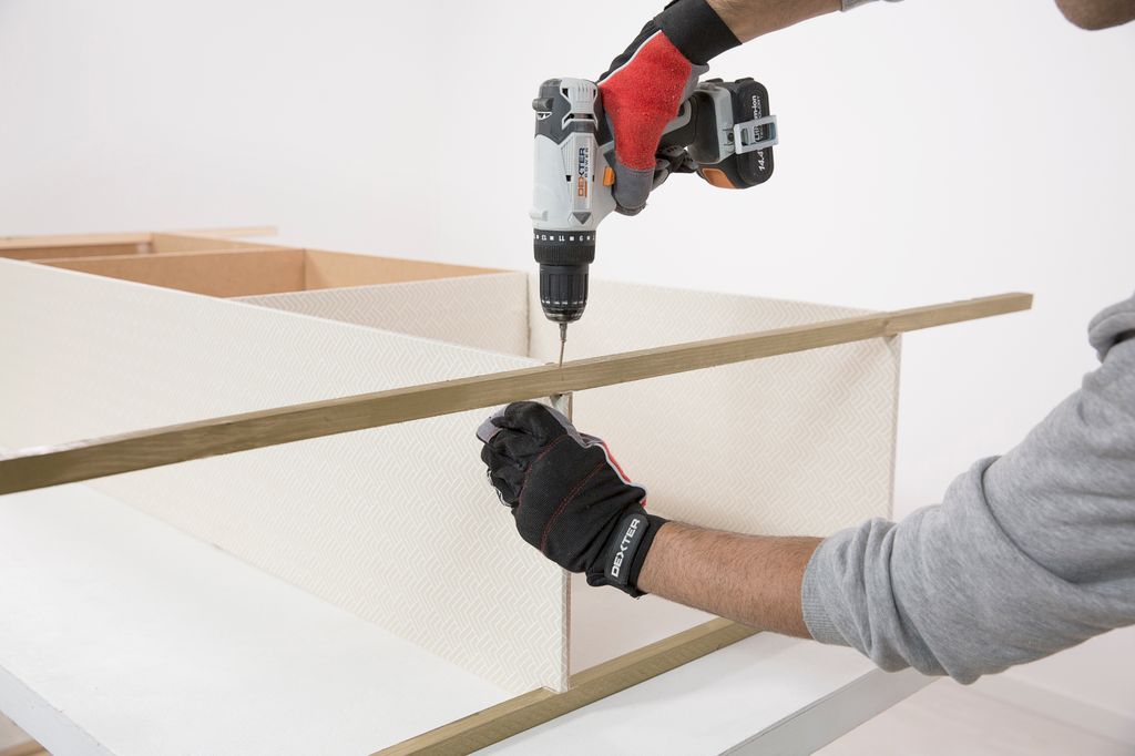 Acopla los listones de los laterales para ir montando la estructura del mueble, que además hacen las veces de patas. Estas piezas se encajan en las muescas que cortaste anteriormente en las esquinas de las baldas y se fijan con tornillos y el atornillador eléctrico.