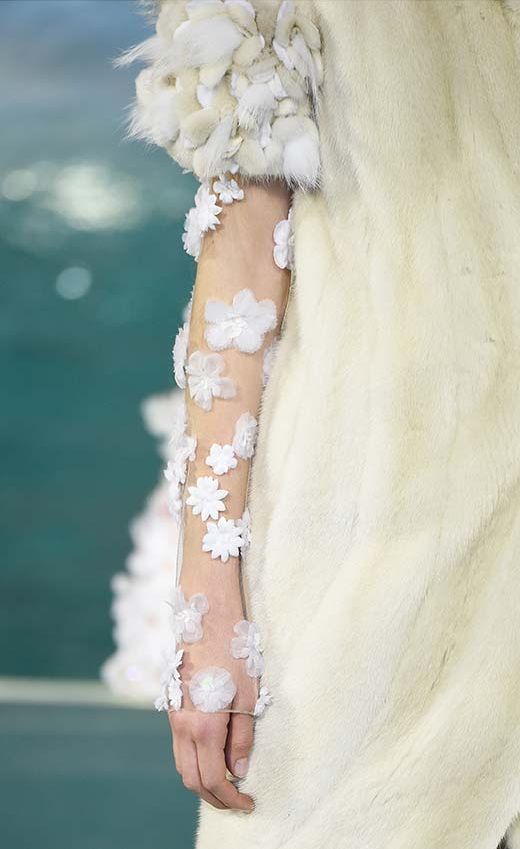 Este zoom a las mangas confirma la artesanía empleada en la elaboración de esta colección. Adornos de pelo y paillettes, en negro y rosa empolvado, cosidos minuciosamente en el acabado de la manga decoran algunas de las piezas de la maison.