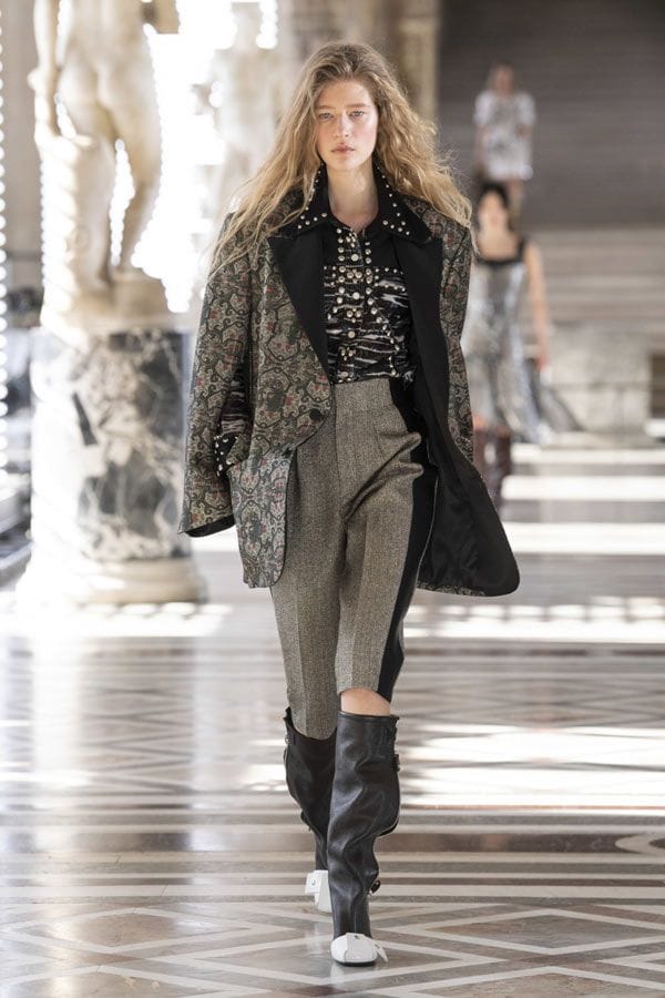 Inspirándose en la obra del pintor Piero Fornasetti, Nicolas Ghesquière ha estampado los clásicos de invierno -como el abrigo, la americana o el chaleco- con algunos de los dibujos del italiano, seleccionados en colaboración con Barnaba Fornasetti, hijo de Piero Fornasetti y actual director artístico del taller Fornasetti. Pero la auténtica innovación está en las combinaciones que propone el diseñador de Louis Vuitton: cazadoras bomber y sudaderas con grandes faldas de tul, chalecos sobre vestidos que crean mezclas de estampados... o este traje en grises y negros que apuesta por que el próximo invierno llevemos botas con pantalón pirata. Un look que puede parecer complicao, pero que realmente es la evolución de, por un lado, las bermudas y, por otro, la mezcla de pitillos y botas altas que está volviendo este año.
