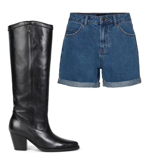 Bermudas vaqueras con doble en el bajo, de Vero Moda; y botas altas básicas con tacón cómodo, de Scalpers.