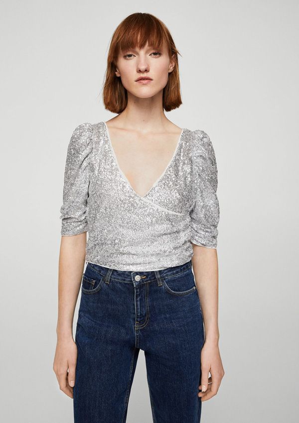 Camiseta bordada con un sinfín de lentejuelas de acabado brillante. Presenta diseño cruzado, detalle fruncido y hombros abullonados, así como escote en pico en la parte frontal y en la posterior, de Mango (39,99 €).