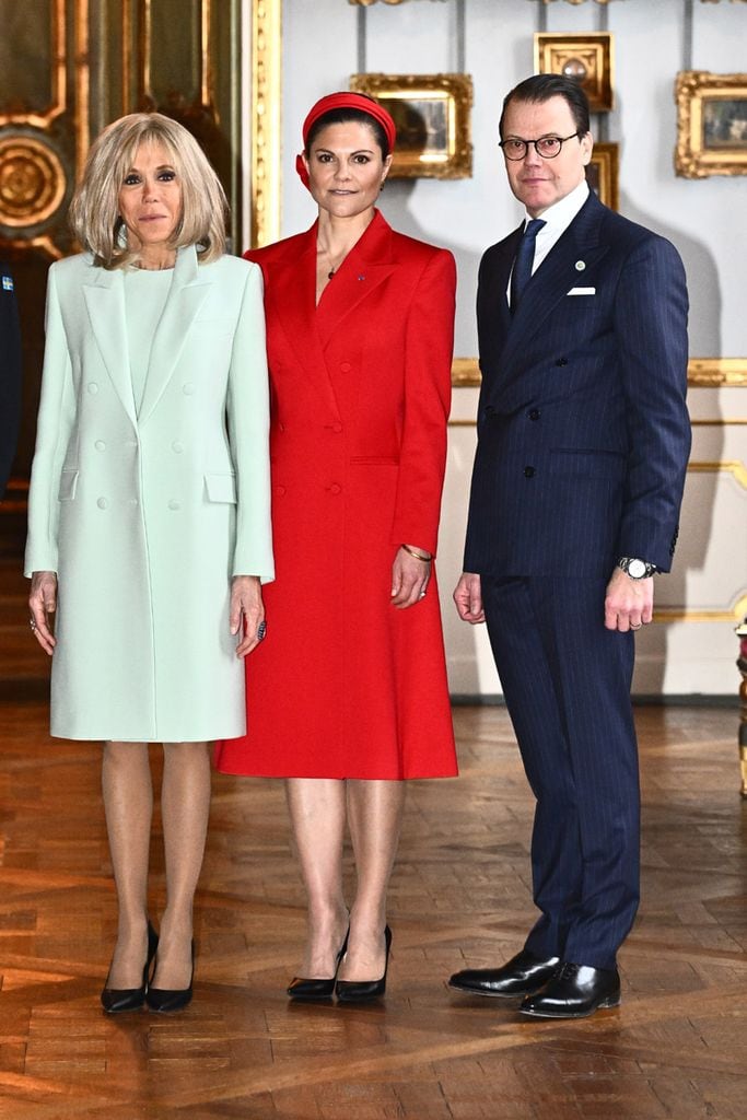 Enfundada en un vestido-abrigo rojo de Pär Engsheden, la princesa heredera de los suecos recibió en el comedor de Lovisa Ulrika del Palacio Real de Estocolmo a Emmanuel y Brigitte Macron para dar comienzo a su viaje de Estado de dos días al país nórdico. Eligió un tocado de diadema con flor tridimensional del mismo color, obra de Tim Mårtenson, en contraste con unos salones negros, de Gianvito Rossi.
