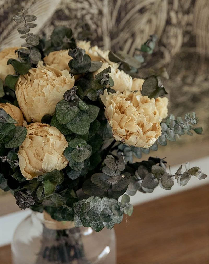Necesitaremos tres peonías blancas. Y, por supuesto, flores de cera, rosas minúsculas, astilbe, cardos y eucalipto para llevar a cabo un conjunto silvestre y armónico como este que se nos presenta desde Tolula handmade.