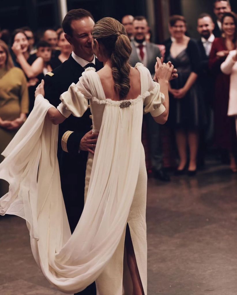 Es muy posible que te hayas topado alguna vez con este estilismo, tan viral en la red. Cristina lució un vestido de Dior en su boda religiosa celebrada en Granada, con una ceremonia en la mágica Iglesia de Santa María, ubicada dentro del recinto de La Alhambra. Completó su look con un velo preciosista, inspirado en diseños de Cristóbal Balenciaga, al que sumó un llamativo broche rectangular cubierto de diminutos diamantes, que ubicó en el escote de pico, con suma elegancia. La suya era una joya heredada, que pertenece a su madre, y que colocó para darle protagonismo, en el centro del look.