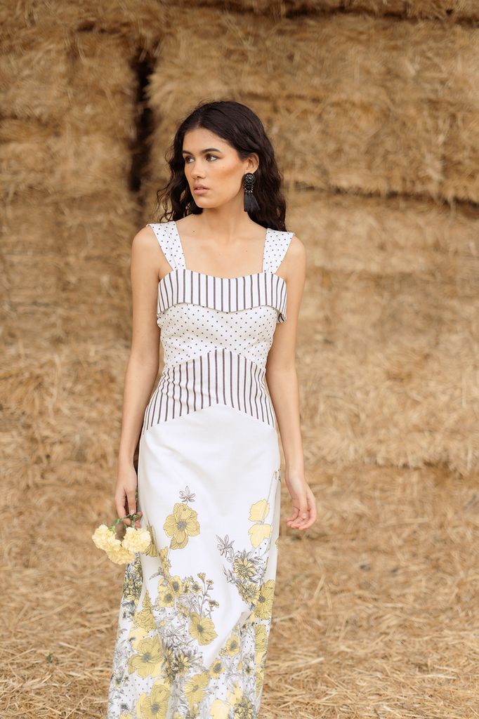 ¿Por qué escoger un estampado cuando se pueden fusionar dos? Es una pregunta que seguro se han hecho en el equipo de Strena. La firma onubense ha querido alejarse de lo clásico con sus vestidos de invitada para esta temporada, ofreciendo una propuesta para convidadas que son amantes del blanco, pero no quieren saltarse las normas no escritas de etiqueta. Sobre estas líneas su diseño Petunia combina flores en amarillo con rayas verticales negras y lunares. Una mezcla a priori que parece imposible y que, sin embargo, funciona a la perfección y ya conquistado a numerosas seguidoras de la marca en la redes sociales.