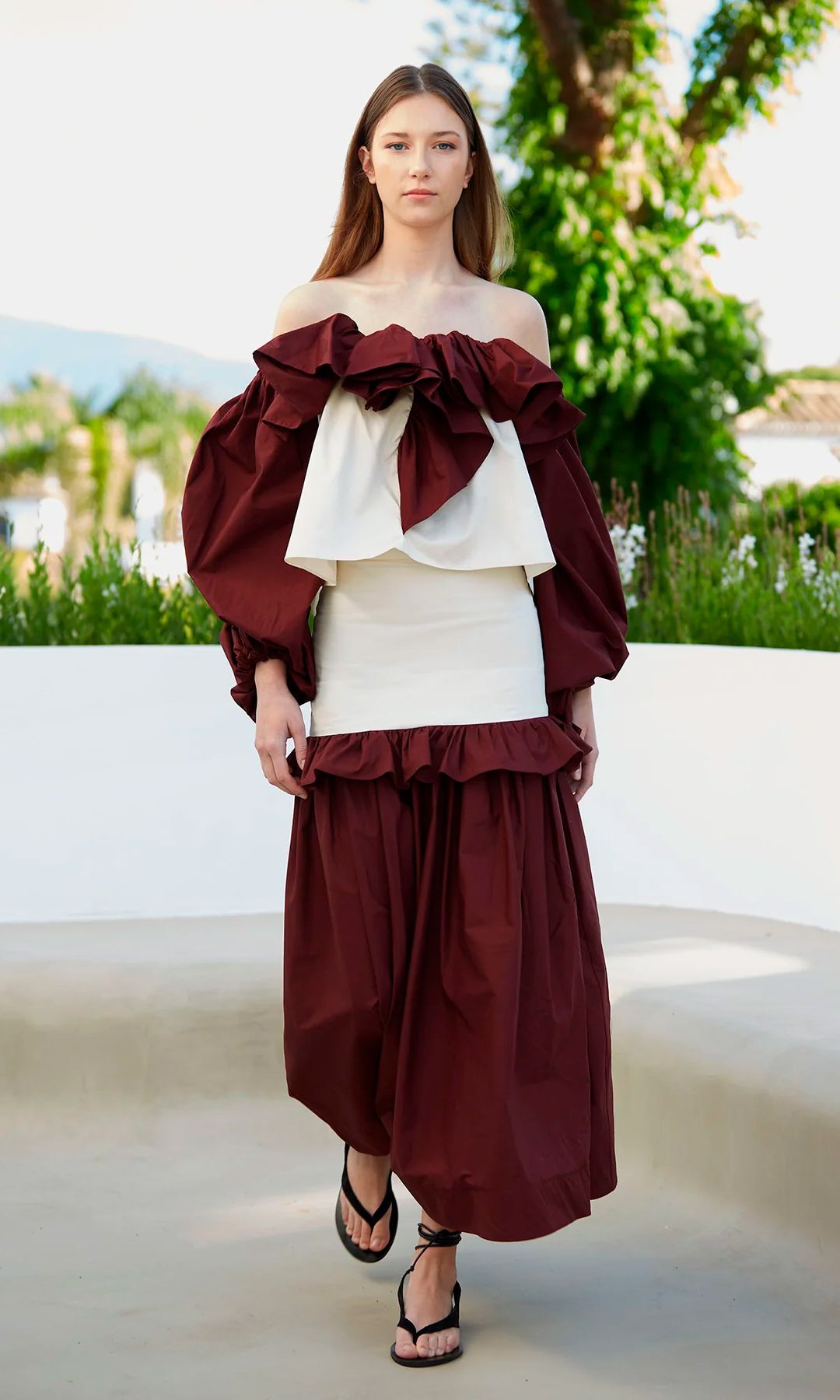 Dicen los expertos que para poder incluir el blanco en un vestido de invitada de boda y no saltarse el protocolo, la superficie ocupada por este tono no debe suponer más del 30% del look. Este conjunto de blusa y falda de la colección Studio de Coosy lo cumple perfectamente, por lo que puede ser una buena alternativa para tu próximo evento. La falda se ajusta hasta la zona baja de cadera, donde nace el volumen, un detalle que favorece y estiliza la figura; el top, que deja a la vista los hombros, tiene mangas de gran volumen. Disponible por 149 euros la falda y 125 euros el top.