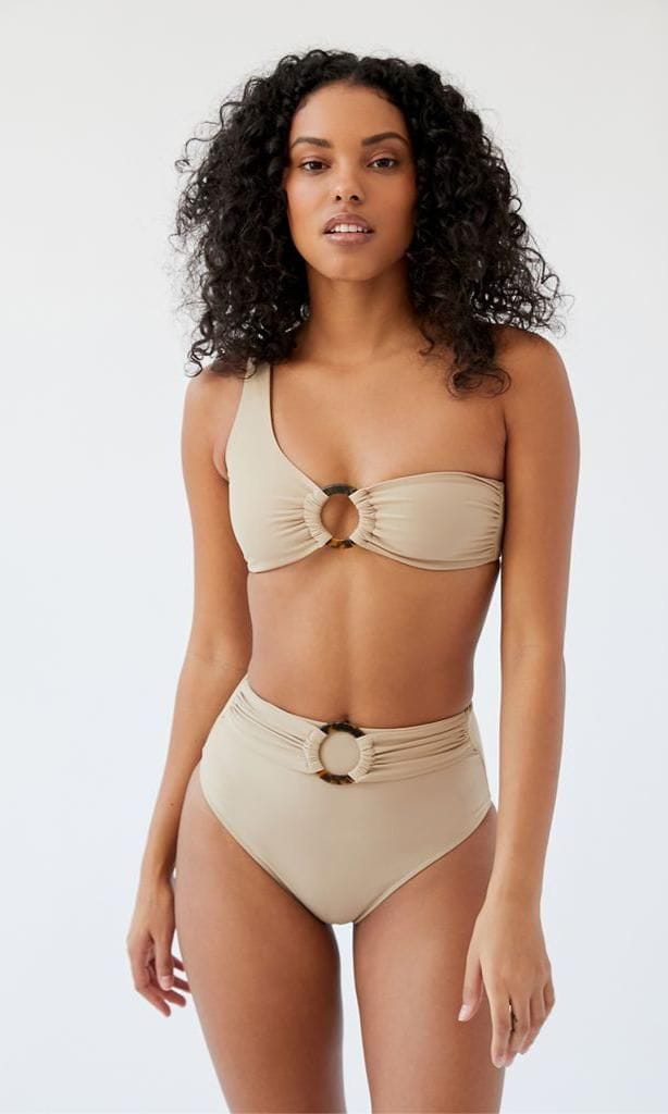 El bikini de Ellejay tiene el top Hayden one-shoulder con copas con fruncido y el bottom Carmen tiene una cobertura trasera moderada y acento circular de carey como detalle del cinturón –una tendencia también en boga para este verano– fruncida. Urban Outfitters ($159.98).