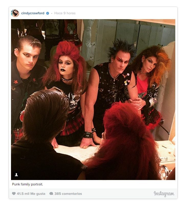 Disfraces en pareja... ¿y por qué no en familia? Cindy Crawford lo tiene claro. Tanto la modelo como su marido, Rande Gerber, y sus hijos, Kaia y Presley, se han disfrazado inspirándose en la temática punky. Melenas cardadas, cazadoras, faldas de tablas, maquillaje muy marcado (para ellos y para ellas), negro y rojo por doquier... unos looks muy conseguidos.