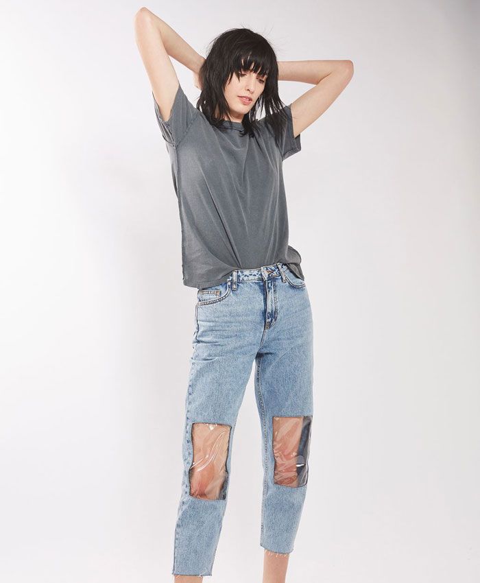 Los pantalones en cuestión, de talle alto y forma holgada, cuestan 68 euros. Sus rodilleras de plástico, un material que han puesto de moda las hermanas Kardashian al lucir botas y sandalias transparentes, permiten ver los muslos y rodillas de quienes los lucen.