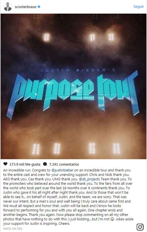 Braun también ha querido recordar la “increíble carrera” del canadiense, sus últimos 16 meses sobre el escenario el escenario y ha aprovechado para reiterar las disculpas en nombre de Bieber y en el suyo propio a todos aquellos que “no podrán verlo”. “Justin volverá y lo hará con fuerzas renovadas por y para todos vosotros. Un capítulo termina y otro comienza. Gracias de nuevo. Ahora, por favor, dejad de comentar en mis otras fotos que no tienen nada que ver con esto”, pedía el representante.