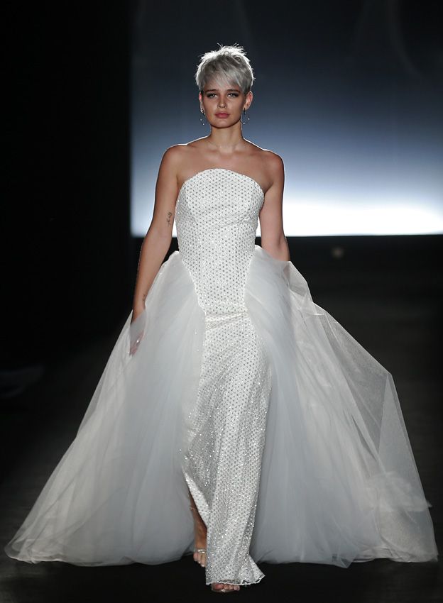 Laura sorprendió con un vestido de palabra de honor y escote en la espalda del que sobresalían dos volúmenes de tul. ¿El resultado? Un estilismo nupcial muy arriesgado, acorde a su corte 'pixie' con flequillo largo en tono rubio