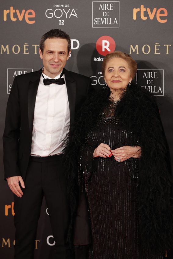 Marisa Paredes, Goya de Honor 2018, está espléndida con un vestido negro de terciopelo de Sybilla y joyas Grassy. A su lado, su hija María Isasi, con un diseño de Rubén Hernández Costura