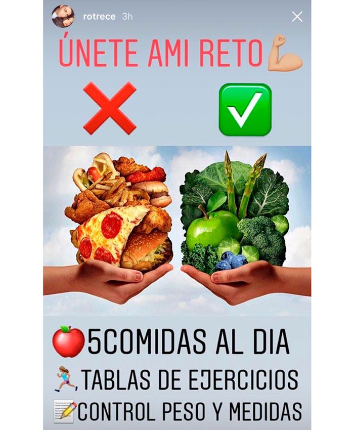 A sus 21 años, es muy consciente de la importancia de cuidarse día a día por lo que se basa en su experiencia personal para ayudar al resto. “Únete a mi reto: cinco comidas al día, tabla de ejercicios y control de peso y medidas”, escribía recientemente en sus ‘Stories’, haciendo referencia a los tres pilares en los que se basa su sistema. Un programa que combina una alimentación equilibrada con algo de deporte y que, tal y como ella misma indica, tiene unos resultados probados a través de fotografías del ‘antes y el después’ de algunas de sus clientas.