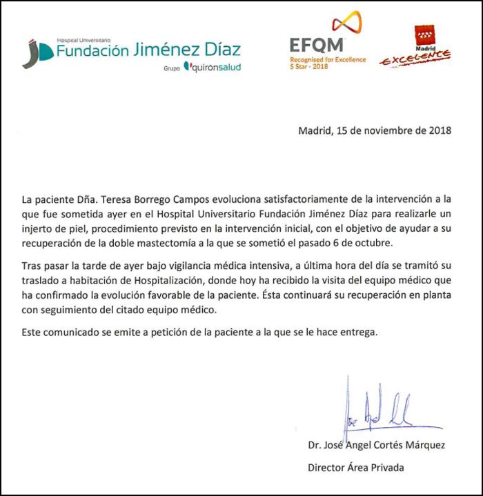 La intervención de la presentadora se ha desarrollado satisfactoriamente. "Todo ha salido bien y dentro de unos días ya estará bien del todo", decía ayer María Teresa a su salida del hospital. Alejandra corroboraba las palabras de su abuela: "Todo está bien". Carmen, por su parte, daba más detalles de la operación de su hermana: "Era una cosa que podía ocurrir, que sabíamos que podía ocurrir, y que desgraciadamente ha ocurrido. Se le ha hecho un injerto porque no ha cicatrizado bien y no ocurre nada más, gracias a Dios. Era una operación sencilla, no era nada grave y las doctoras han salido muy contentas".