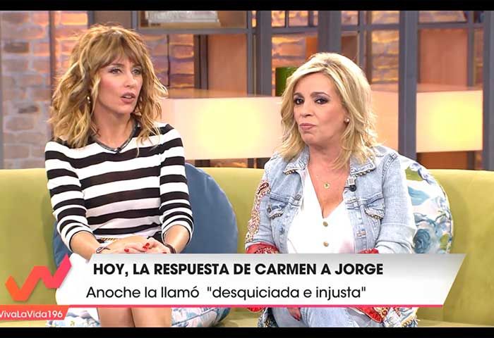 Mientras la expresentadora de Con T de Tarde rehusaba opinar acerca de las palabras de su hermana, Carmen tomó el testigo del enfado de Jorge Javier y volvió al día siguiente al plató del magazine de Emma García para hacer público su parecer ante las declaraciones del conductor del programa nocturno: "Terelu y yo somos muy diferentes. Si llego a ser yo la que está allí anoche, o cojo la puerta y me voy o a lo mejor tiene que venir la policía al plató. Ella no se espera que Jorge diga esto y se queda sin palabras, creo que pensó en el momento 'mejor me callo'". La colaboradora continuaba su nueva entrevista dejando claro lo que sintió al escuchar a Jorge: "Se me saltaron las lágrimas. No me lo esperaba de él, se le ha ido un pelín la mano". Aunque reconoció que hay partes del discurso de su excompañero de las que tomó buena nota para recapacitar, quiso dejar muy claro que no será capaz de perdonar ciertas palabras. Una afirmación que sigue aportando más leña al fuego a esta auténtica guerra fría.