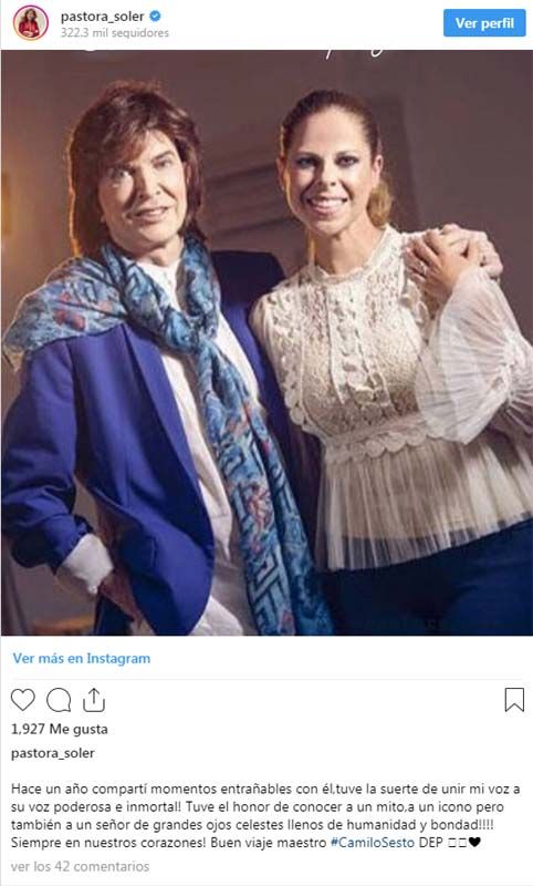 Otras de las artistas que se han sumado a las condolencias y han mostrado su pesar por el fallecimiento de Camilo Sesto ha sido Pastora Soler, que participó en su último disco Camilo Sinfónico