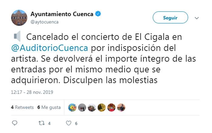 El Cigala aún no se ha pronunciado públicamente acerca de la cancelación de este concierto en el que, según el Ayuntamiento de Cuenca, a todos los que tenían entradas "se les devolverá el importe íntegro". Lo que sí se espera es que este sábado 30 de noviembre actúe en el Teatro Buero Vallejo de Guadalajara, donde tiene una cita a las 20.00 horas junto a Jaime Calabuch 'Jumitus', encargado del piano. Además, el 2 de diciembre, el 11 y el 16 se reencontrará con el público madrileño en el Teatro Nuevo Alcalá, en la plaza de Las Ventas y en el Teatro Rialto, respectivamente. También tiene cerradas fechas en Valencia y Barcelona.