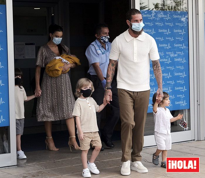 La salida de los seis miembros de la familia del hospital -Sergio Ramos, Pilar Rubio y sus cuatro hijos- se producía con las pertinentes medidas de seguridad impuestas tras la crisis sanitaria del COVID-19. Así, los tres hermanos mayores de Máximo Adriano han lucido mascarillas negras de tela -a diferencia de las de sus padres, que eran quirúrgicas-. Sergio Ramos ha hecho su aparición el primero y a él se han agarrado Marco y Alejandro, mientras que Pilar Rubio, que sostenía al bebé en brazos, iba de la mano de Sergio Jr.