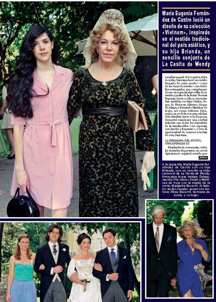 La duquesa de Alba, abuela y madrina del novio, siguió la ceremonia sentada en primera, la junto a su hijo Jacobo Martínez de Irujo, su nuera Inka Martí, condesa de Siruela, y el resto de sus hijos, Eugenia, Carlos -el actual duque de Alba-; Alfonso y Fernando Martínez de Irujo (Cayetano no pudo asistir porque estaba participando en una prueba hípica en Francia), así como Alfonso Díez, para el que esta boda supuso su debut en una celebración familiar junto a la añorada Cayetana.