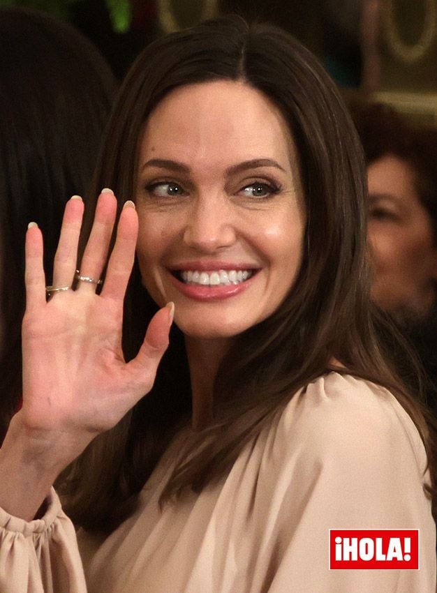 Elegantísima con un vestido midi en color beige, de mangas abullonadas, y adornado con un cinturon de la firma Valentino, la protagonista de Eternals llegó al Salón Este de la Casa Blanca acompañada de su hija, de 17 años, que para la ocasión se recogió el pelo en dos coletas y lució un abrigo marrón de lana, acompañado de unas Converse.