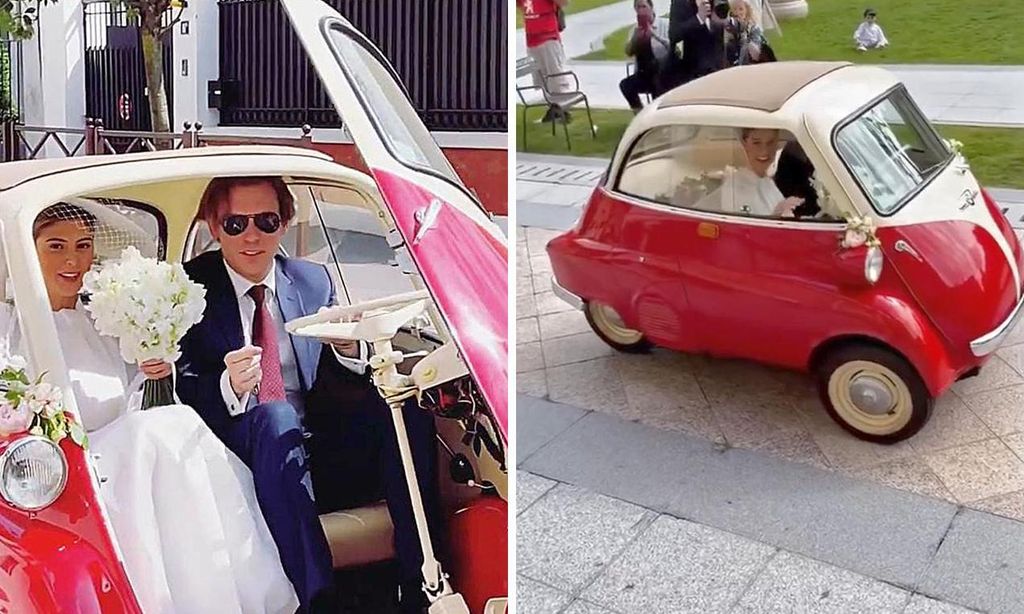 Una vez celebrado el enlace civil, los recién casados salieron entre una lluvia de pétalos de flores y, siguiendo con la estética vintage y cool de la boda, se marcharon en un microcoche ‘retro’ y muy sofisticado: un BMW Isetta, rojo con el techo de color crema. Este minivehículo con apertura frontal se creó en Alemania en los años cincuenta.