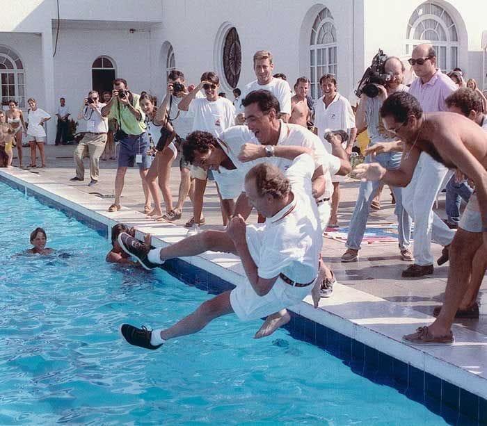 Por anécdotas reales, seguramente la mejor es la que relata Pedro Campos, el regatista más laureado, que se ha ganado el apelativo de Mister Copa. Cuando ganó la edición de 1993 con el Bribón VIII de José Cusí y Juan Carlos I, la tripulación se mostró indecisa en el momento de seguir la tradición y lanzar al agua al vencedor. “Vaya tripulación más sosa tenemos, ¿no?”, ledijo el Monarca a su armador, Cusí. Campos aceptó el reto y acabó empujando al Jefe del Estado a la piscina, y los tres celebraron el triunfo en el agua, como es debido.
