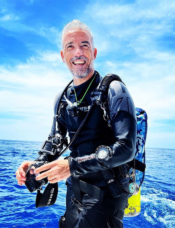 Asegura que le encanta transmitir su pasión por el buceo, una disciplina a la que se dedica desde hace dos décadas. No hay duda de que estar bajo el agua es para él una forma de vida. Tal es así queha llegado a protagonizar un desfile de moda subacuático en el que lució a 20 metros de profundidad y en apnea las prendas de las firmas del centro comercial donde imparte sus formaciones. Aunque ahora desarrolla su actividad profesional en Madrid, donde además de trabajar en televisión realiza numerosos cursos y entrenamientos, tanto en grupo como de forma personal, en cuanto puede se escapa a la costa para poder disfrutar del fondo marino en todo su esplendor, lo que incluye hasta nadar entre tiburones.