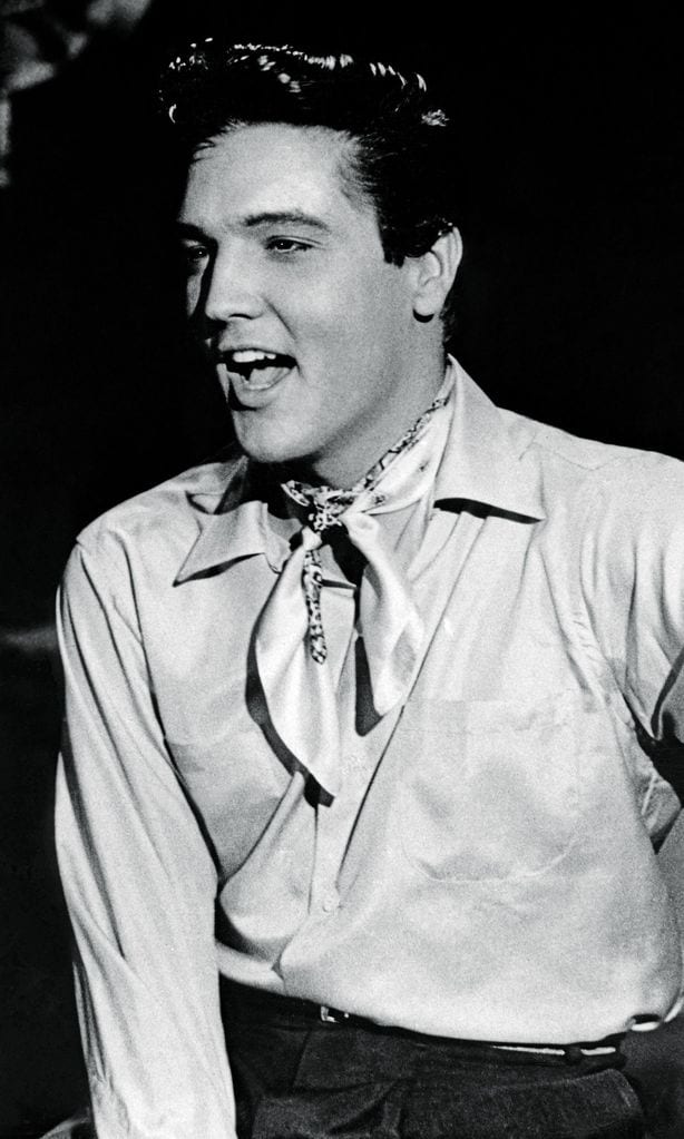 Presley marcó tendencia por su voz, sus hipnóticos movimientos de cadera y, obviamente, por su estilo atrevido y rompedor, bastante alejado de los cánones de la moda masculina de los años 50. Sus camisas hawaianas, la biker de cuero, la chaquetas de estilo bomber, los mocasiones bicolor en blanco y negro, los pantalones tobilleros con calcetines largos y sus icónicos monos de pata de elefante, cuajados de bordados y pedrería, forman parte del emblemático armario del cantante, como también sus camisas de satén de vivos colores y sus pantalones sastre súper anchos.