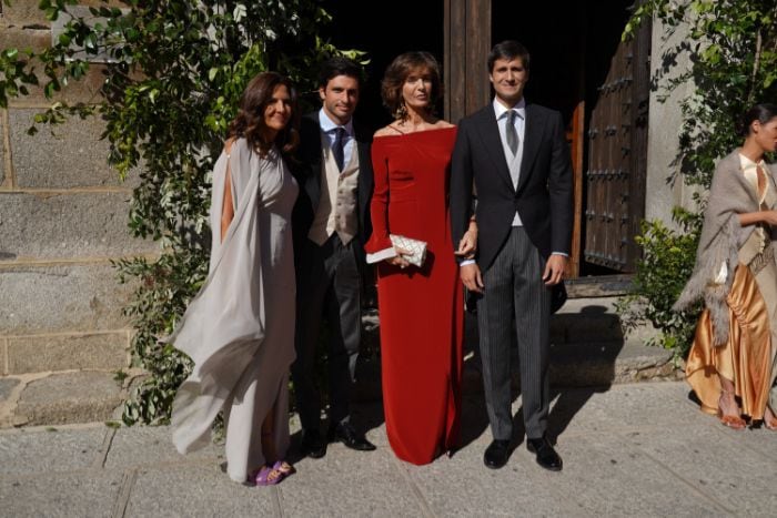 Minutos antes de la esperada llegada de Blanca, hemos visto a invitados como la madre del novio, que se ha mostrado muy cómplice con su hijo, con quien ha aparecido agarrada de su brazo. Enfundada en un espectacular vestido granate de manga larga que realzaba su fantástica figura, ha complementado su look con un clutch en crudo de tachuelas a conjunto con sus sencillas sandalias.