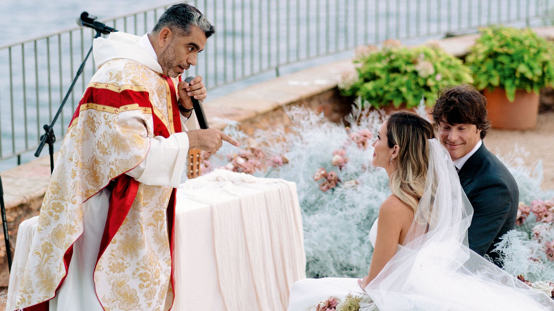 Con el sol poniéndose e iluminando de dorado el lugar, la pareja intercambió sus votos y hubo momentos muy emotivos, en los que la novia no pudo reprimir las lágrimas. Entre las lecturas elegidas por la diseñadora y empresaria —para ella era especialmente importante oficializar su amor con el padre de su hijo frente a Dios—, de las que se encargaron su hermana Renata y su padrino Guillermo, estaban el Eclesiastés, la Carta del Apóstol San Pablo a los Corintios y el Salmo 'Dichosos los que temen al Señor'. También Samantha y Pepe dedicaron unas cariñosas palabras a la pareja. Y Fray Marcos sorprendió a todos —incluidos Becca y Jordi— al coger la guitarra y entonar, durante su homilía, algunos versos de la Biblia. Incluso se atrevió con el portugués. Otro de los instantes inolvidables fue el intercambio de alianzas, con el pequeño Noah junto a sus padres, mientras sonaba la música de Yellow, de Coldplay. También se escucharon el Ave María, durante el ofertorio, y Stand by me de Ben E. King, en las firmas de actas. Los recién casados salieron de la mano, dispuestos a comenzar la gran fiesta, bajo la música de Blinding Lights, de The Weeknd.