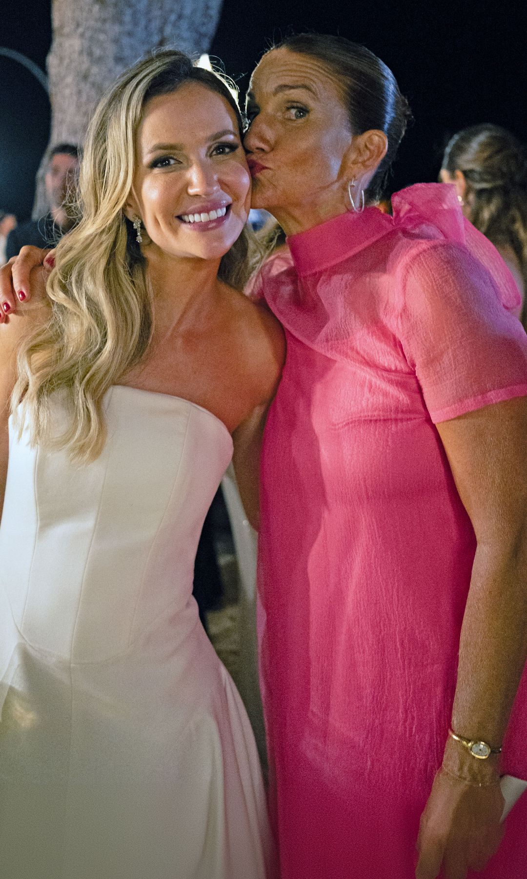 Quedaba desvelado el secreto mejor guardado siempre. Becca estaba radiante, con un vestido palabra de honor de corte clásico, sencillo, minimalista y elegante, con mucha personalidad y muy acorde a su lema de 'menos es más', del reconocido diseñador brasileño Carlos Bacchi. Completaba el look nupcial con un velo de tul, añadiendo romanticismo y tradición. Los tacones eran de Mascaró y apostó por los diamantes, porque marcaban a la perfección el estilo puro del traje, y por piezas antiguas: una pulsera art decó, de 1930, y unos pendientes en cascada. El ramo, en forma alargada y estilizada, como siempre había querido ella que, como arquitecta, adora las líneas depuradas, fue realizado por el estudio de Mireia Abras, con lisianthus tono sepia y rosa antiguo, tintado de una manera muy especial, elevando el look de los complementos, asparagus dorado mate y rosas grises, y en sintonía con los ramilletes de las damas. En su beauty look, del que se encargaron Ana Renedo, una de las damas de honor y maquilladora oficial de MasterChef, y Marcos Ghera, su peluquero de confianza, se buscó también la elegancia y naturalidad, resaltando la belleza de la novia.