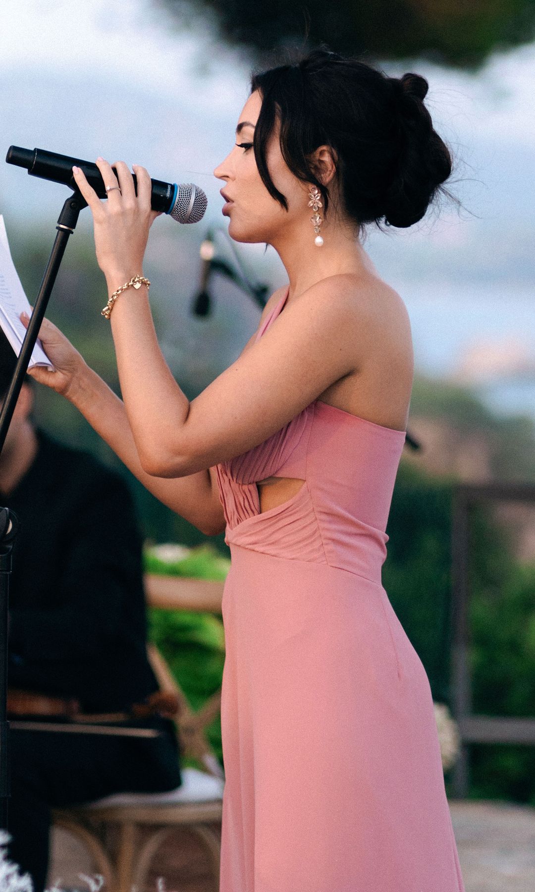 Los invitados en sus sillas, Jordi impaciente por ver a la novia… Todo estaba listo para la aparición estelar de Rebecca que, como manda la tradición de todo enlace, se hizo esperar. Primero hicieron su entrada las 15 damas de honor, familiares e íntimas amigas, al son de A thousand years, de Christina Perri, con vestidos exclusivos diseñados por ella misma y su firma Inti Brand, todos modelos únicos pensados para cada una de ellas y de la misma gama de color, pero en diferentes tonalidades. El cortejo nupcial se completaba con los seis pajes, cinco sobrinos de los novios, con las arras, y su hijo Noah, encargado de las alianzas, realizadas expresamente para ellos de forma artesanal, en oro amarillo —la de él más ancha, y más fina la de ella— con la fecha de la boda y las iniciales grabadas, de la joyería Novecento, regalo de unos buenos amigos.