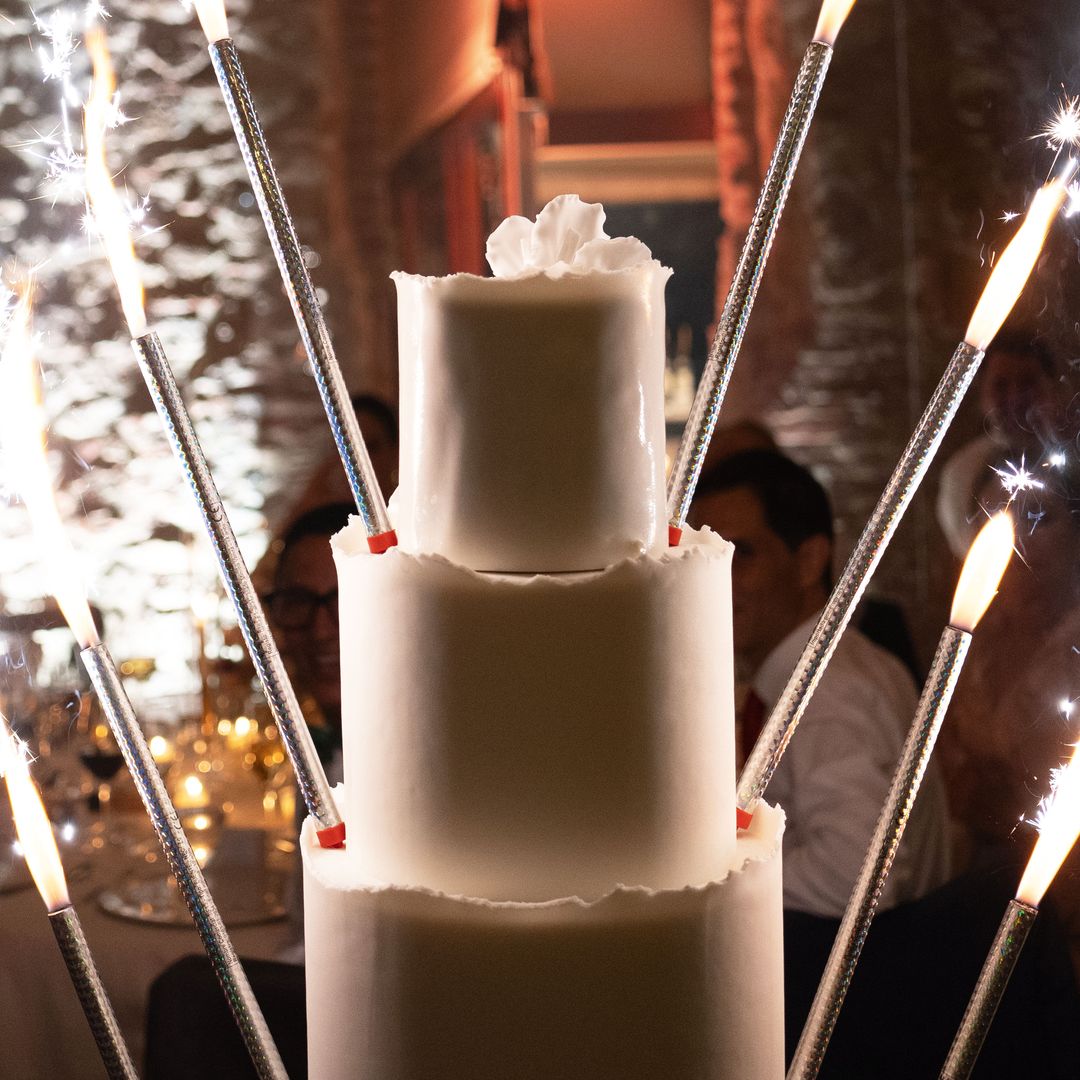 El menú de la cena dejó con la boca abierta a más de uno. Elegido con mimo por Jordi, impresionó a los paladares más exigentes —y ojo, que había muchos—. "Yo siempre hago lo mismo, le pregunto al chef qué es lo que mejor hace y me pongo en sus manos. En esta ocasión, he hecho exactamente lo mismo: hablamos, me enseñó, me dio cuatro ideas, me parecieron maravillosas, sobre todo el plato principal, que me parece una genialidad poder dar bogavante y huevos fritos en una boda", nos cuenta Jordi. "El menú es creativo, es coherente, es lógico, factible, es divertido, moderno, es un todo y estamos encantados". Y así de encantados quedaron los comensales, que además probaron ceviche y pudieron degustar dos postres con sorpresa. Y fue el paraíso de los golosos, porque hubo también una espectacular tarta: de cinco pisos, tenía acabado de fondant blanco, con efecto de papel rasgado y flores de azúcar del mismo color, con formas abstractas, formando una cascada.