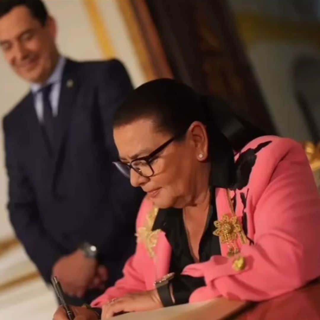 En esta imagen, realizada por Lorena Sánchez, que estaba espectacular con un vestido del diseñador Zambonino, vemos a Manu Sánchez firmando en el libro de honor ante la mirada de Juan Manuel Moreno Bonilla. "Llevo un tiempo dando unos disgustitos a mis seres queridos, así que mañana toca, un día bonito", expresó el humorista