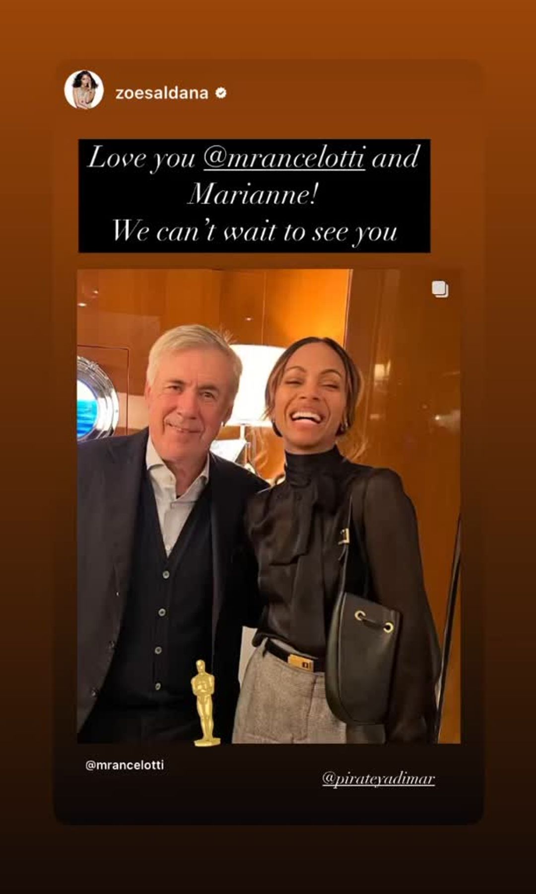 Carlo Ancelotti, entrenador del Real Madrid, ha sorprendido a todos sus seguidores con esta foto en la que aparece con la actriz Zoe Saldaña, ganadora de un Oscar por su papel en Emilia Pérez, la polémica película protagonizada por Karla Sofía Gascón. "Enhorabuena a nuestra amiga Zoe. Te lo mereces todo. Estamos muy orgullosos de ti", ha escrito el técnico italiano.