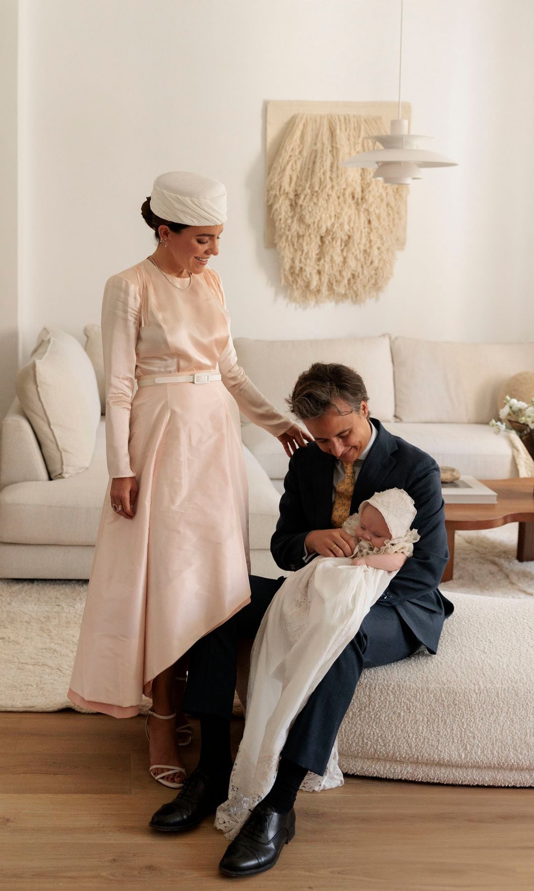 A sus apenas tres meses y medio, Manuela cautivó a todos los presentes con su ternura. Para su gran día, lució un faldón de cristianar diseñado en exclusiva por Mandarina Gris, elaborado a mano a partir de encajes antiguos del siglo XIX, sedas naturales y bordados personalizados. Una pieza única que Paula había imaginado tiempo atrás, inspirándose en una antigua revista que guardaba con cariño.