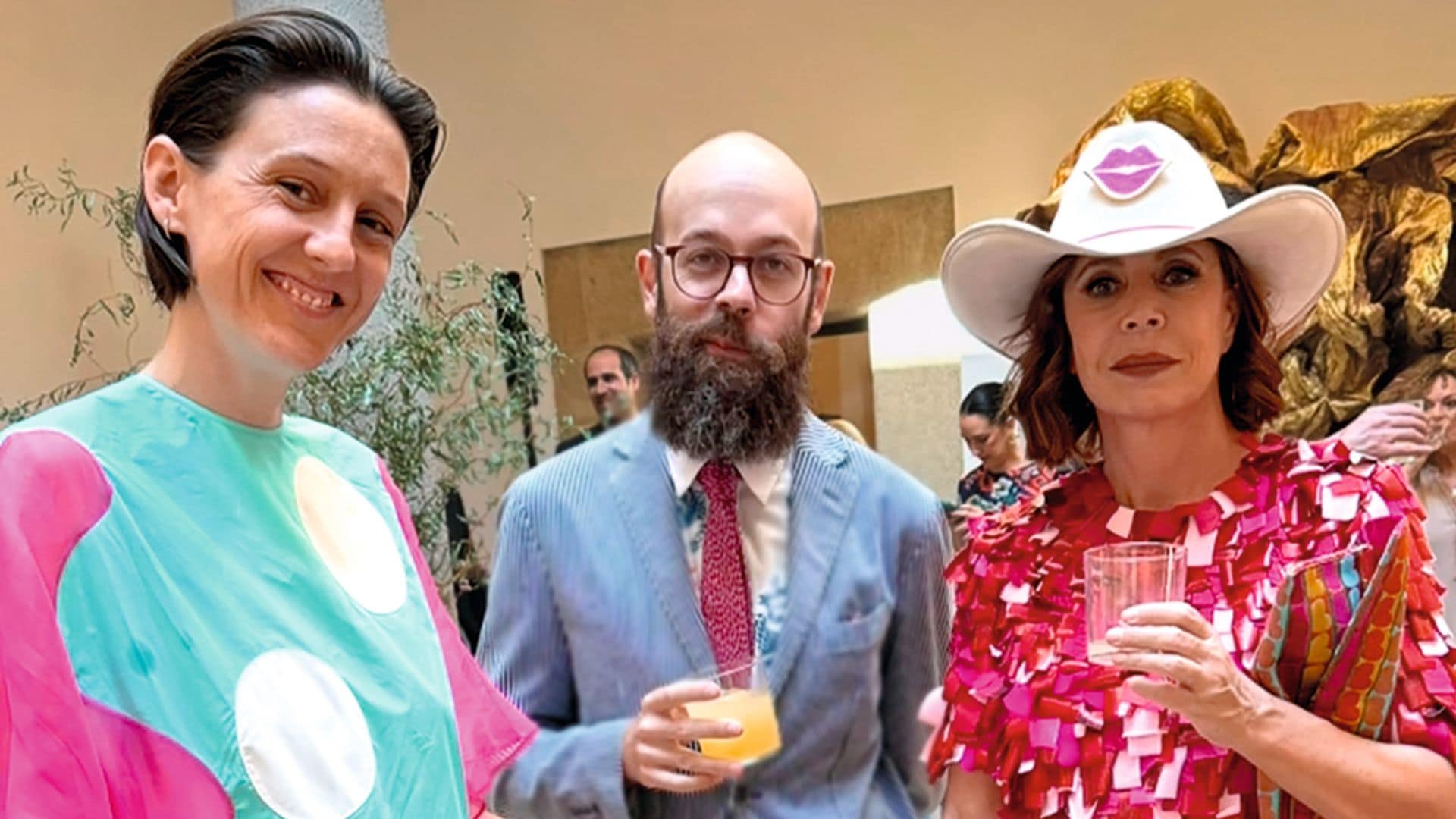 Por su parte, la diseñadora, fiel a su estilo, destacó entre las regias calles de la Villa de los Mil y un Escudos con un vestido —por encima de la rodilla y manga corta— en distintas tonalidades de rosa, las cuales estaban dispuestas sobre la tela como si fueran 'tiras', produciendo así un original efecto que captó todas las miradas. Lo combinó con unos salones estampados en los mismos tonos que el vestido, un bolso clutch con sus típicos corazones y un divertido sombrero cowboy blanco con detalles fucsias, ¡todo un statement!