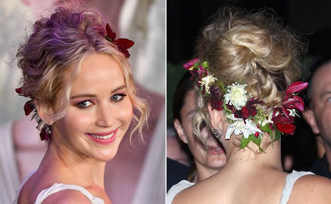 Jennifer Lawrence te ofrece una hermosa opción para decorar tus recogidos. En primer lugar hazte con varias flores de plástico, pero, si deseas que el resultado sea como el de la actriz, busca aquellas cuyo acabado sea natural. Después parte de una melena ondulada, ¿cómo? escoge entre dormir la noche anterior con trenzas para conseguir ondas naturales o usar un rizador, tú decides. A continuación carda la parte superior de tu melena y pon un toque de laca para fijarla, ¿tienes el pelo cortado a capas? Si es así deja sueltas las más cortas y con la parte inferior haz una trenza de tres cabos normal, después llévala hacia arriba y sujétala con horquillas, usa el resto del cabello para cubrir las puntas y ocultarlas, si tienes el pelo recto divide la melena en dos y con la parte de arriba haz una coleta y acomoda el cabello a modo de moño cubriendo también las horquillas. Por último coloca las flores desde la zona de la nuca hacia arriba a modo de diadema invertida.