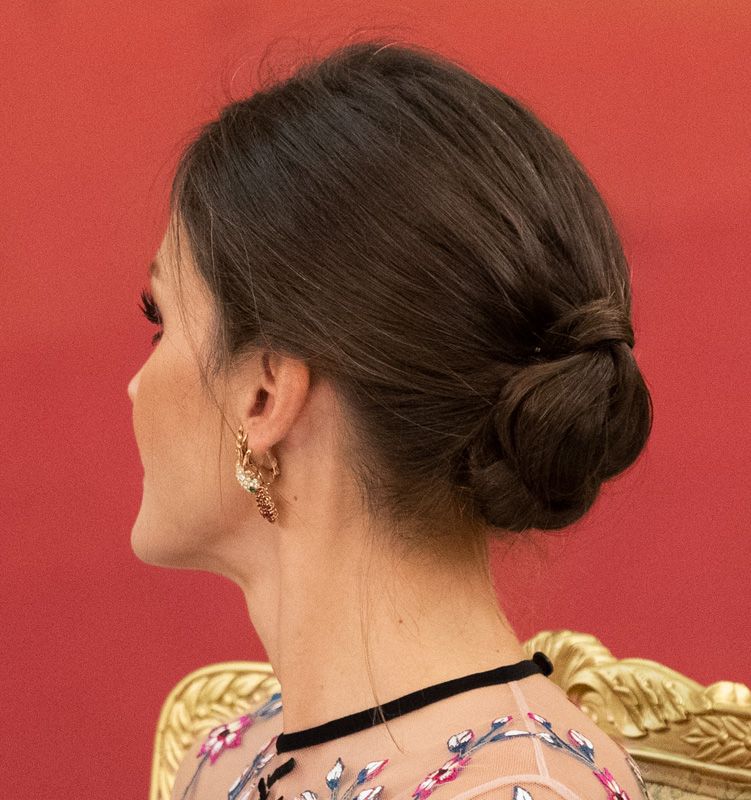 Los recogidos suelen ser una apuesta ganadora para la Reina. Son uno de sus peinados favoritos en las ocasiones más formales, y suele optar por estilos clásicos. Por ejemplo, su moño trenzado o su recogido caracola han sido muy comentados. En la cena de gala celebrada con motivo de la visita de Estado a Corea en la capital del país asiático, doña Letizia también apostó por recoger su melena, con raya lateral y un recogido medio, que dejaba el cuello despejado y cedía todo el protagonismo a su vestido de transparencias y bordados florales de la firma británica Temperley London.