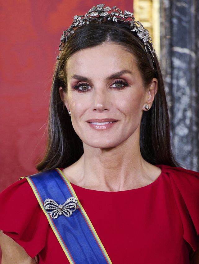 La esposa de Felipe VI escogió su favorita, la tiara floral de Mellerio, pero llamó la atención la forma en la que la llevaba. Hasta ahora, la Reina siempre había lucido esta pieza elevada, apoyada sobre el cabello, sin embargo, anoche apareció con ella a modo de diadema.