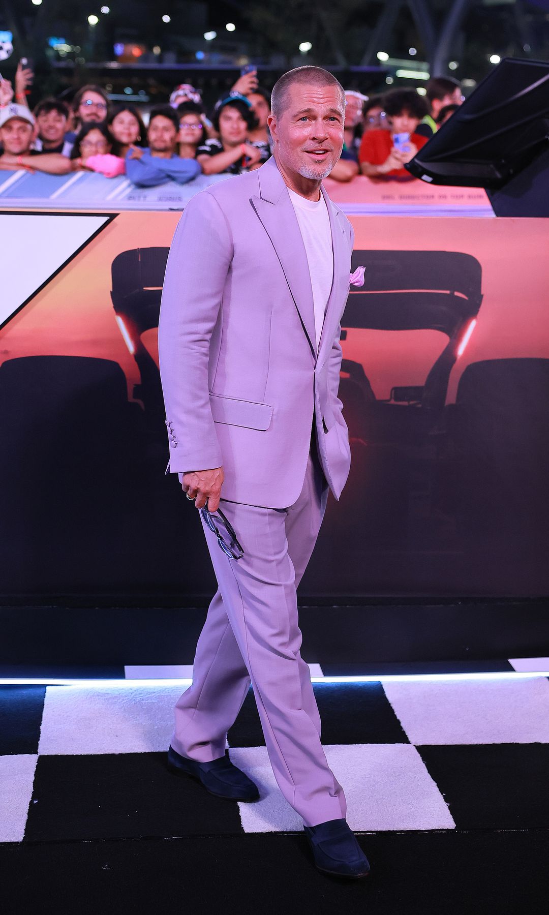 Horas antes del estreno, el actor fue protagonista también de la rueda de prensa que dio junto a parte del equipo de F1: La película en el hotel de cinco estrellas Sofitel Reforma, en Ciudad de México. En este caso, se decantó por un traje en tono salmón y camiseta básica azul.