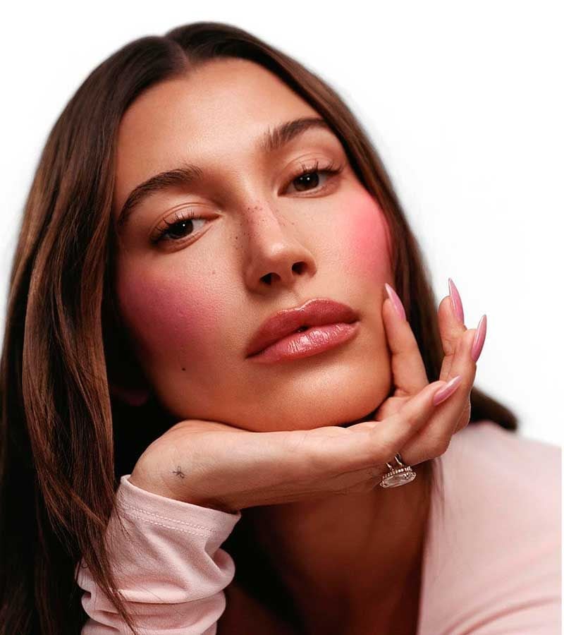 Pero ahora que estamos casi casi en verano, Hailey ha decidido dejar a un lado este tono café para apostar por un color más vibrante y llamativo, el rosa fuerte con el que ya ha aparecido en sus redes sociales en varias ocasiones. Sin embargo, esta ocasión no se trata de la conocida tendencia como Glazed Blush, en la que las mejillas se cubrían de un colorete rosa intenso con un toque brillante con el que se imitaba un efecto glaseado muy bonito, sino de resaltar muchísimo el rubor en los pómulos olvidándonos de ese brillo. Esta tendencia es la conocida como Strawberry Pink Blush.