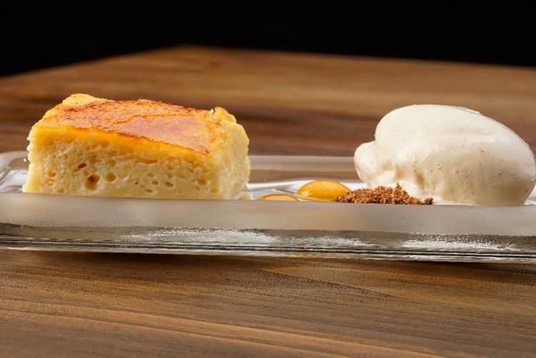 En Marea Alta, el chef Enrique Valentí se ha especializado en pescados a la brasa y ahumado, recetas estrella que se disfrutan con las mejores vistas de Barcelona desde la planta 23 del edificio Colón. Entre sus postres, esta torrija con caramelo de canela, esa chispa que la hace especial, es toda una tentación para los amantes del dulce.