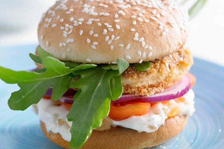 La merluza tiene una textura ideal para mezclarla con otros ingredientes y convertirla en una rica hamburguesa. La servimos en su pan correspondiente, con su lechuga, su tomate y su cebolla y la acompañamos con una mayonesa de jengibre.